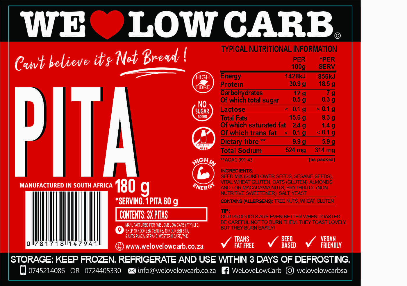 Net Carbs – 4,2g per pita; Total Protein – 18.85g; Total Fat – 10.4g