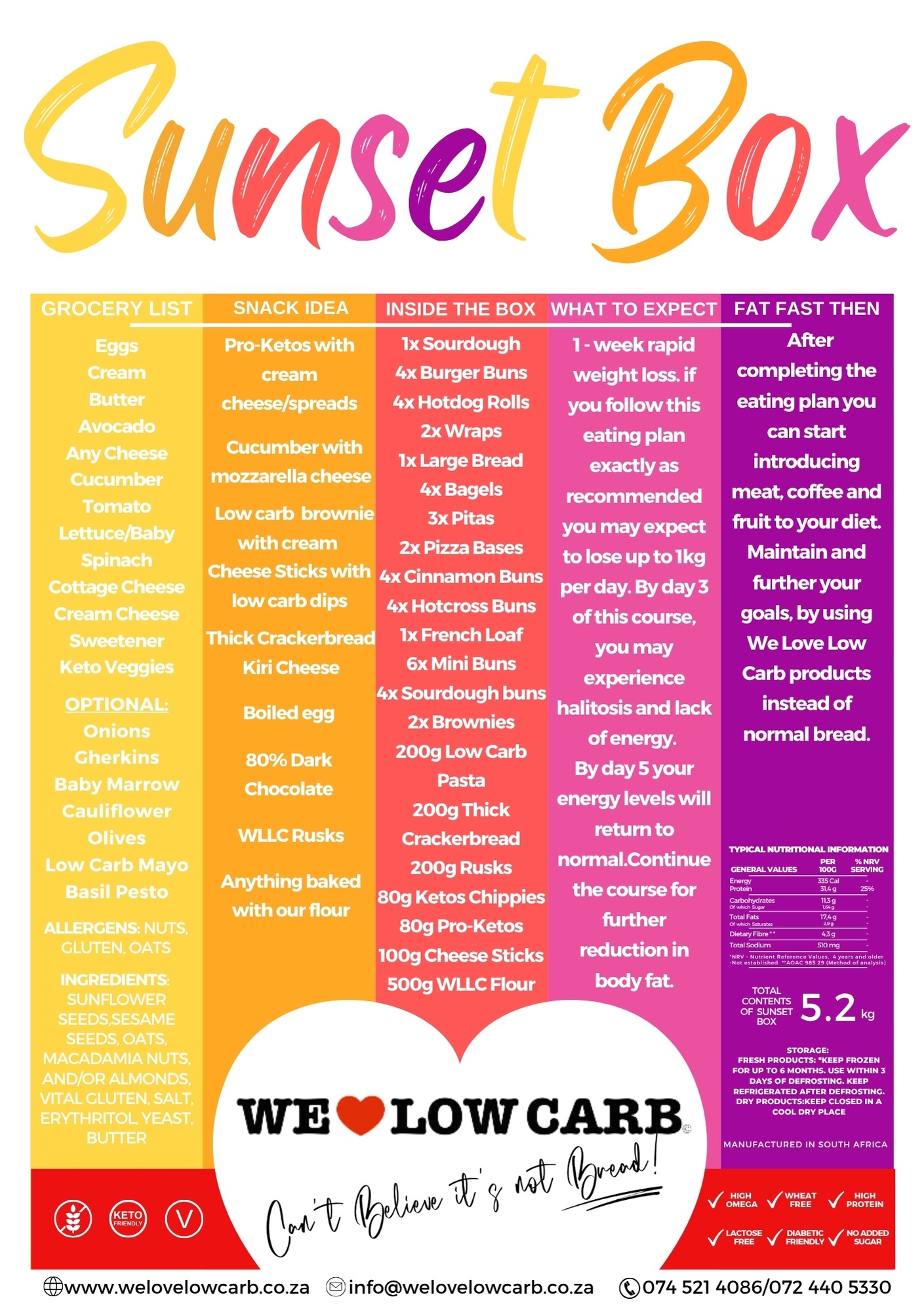 Content of box: 1x Sourdough, 1x Large bread, 4x Burger buns, 4x Hotdog buns, 2x Wraps, 4x Bagels, 3x Pitas, 2x Pizza bases, 4x Cinnamon buns, 1x French loaf, 4x Hot Cross buns, 6x Mini buns, 4x Sourdough rolls, 2x Brownies, 1x 200g Low Carb Pasta, 1x Pack Thick Crackerbread, 1x 200g Rusks, 1x 80g Ketos Chips, 1x 100g Cheese Sticks, 1x 80g Pro Ketos, 1x 500g WLLC All purpose flour.